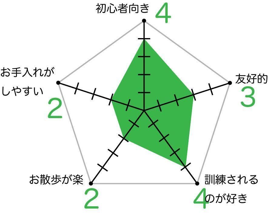 ピレニアン・シープドッグの飼いやすさ 各項目の数値が大きいほど飼いやすい傾向