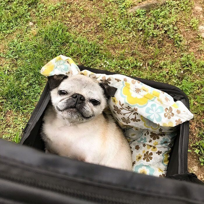 ペットカートでくつろぐめー、何の警戒もなかった!|連載「パグ犬・めー」vol.113