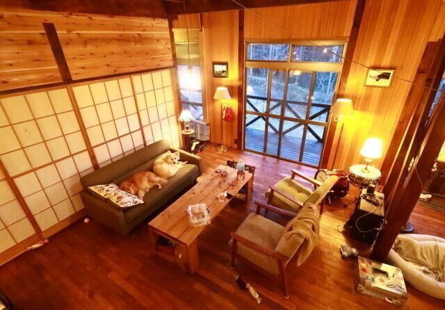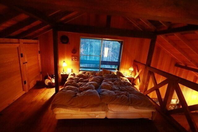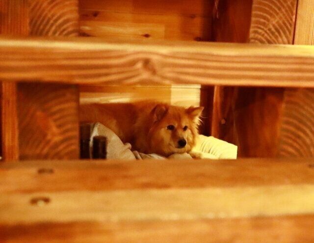 しかし昨年、建て直すのを諦めて、補修してリノベーションしようと方向転換した。であれば当然、ここを物置にしておくのはもったいない。そこで大工さんに壁をぶち抜いて吹き抜けにしてもらい、犬も上り下りできる階段と、落ちないように手すりを作ってもらって、ここを寝室にしようとした結果がこちら。