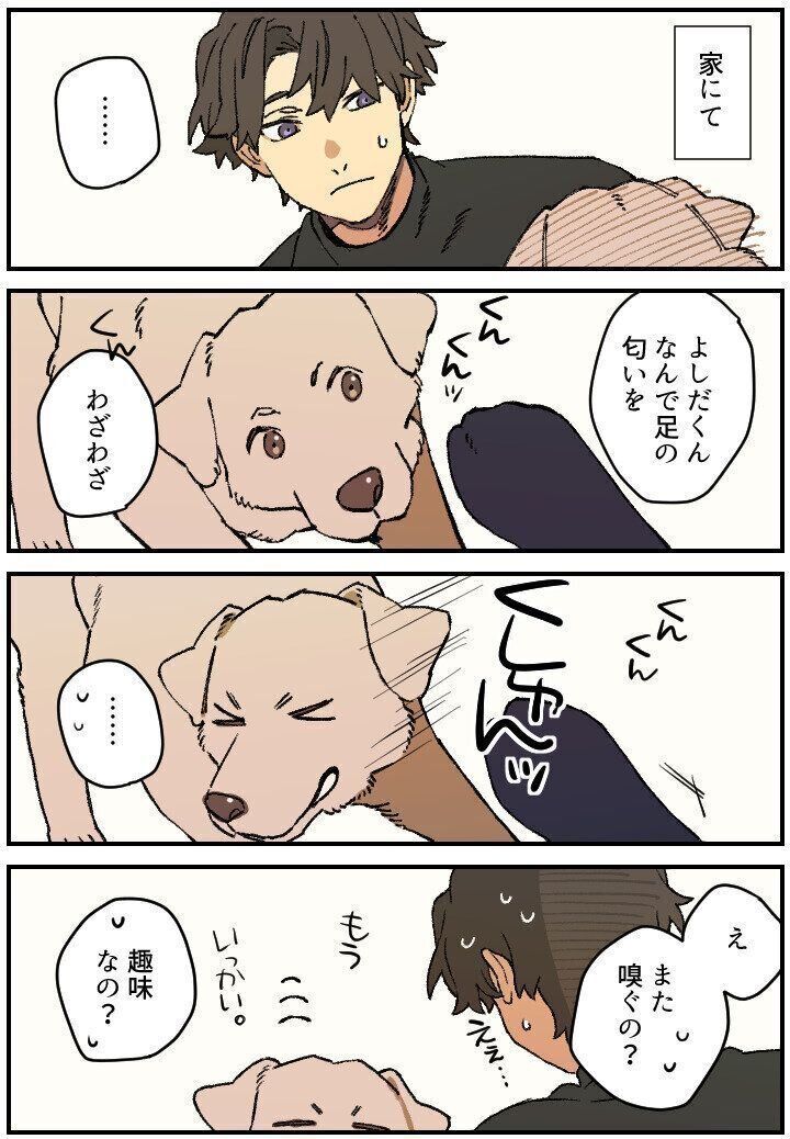 【連載】暮瀬姉弟と吉田くん 吉田くんと家にいる周一。その足元、正確には周一の足の匂いを嗅ぎにいく吉田くん。いい匂いがするとは思えないながら見守っている周一の足の匂いを嗅ぎ、クサッという仕草とくしゃみで顔をそむける吉田くんに少しショックを受ける。しかし、吉田くんは再度周一の匂いを嗅ぎにいくのをやめないので、もはや一連の流れが趣味なのでは……?と疑う周一だった。