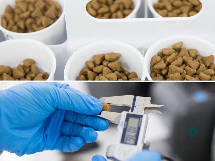 また、製造工程では、「正確な栄養バランス」を提供するため、各原材料を正確に計量し、「嗜好性」と「消化性」を高めるため、微細な粒子サイズに粉砕します。食品の安全・品質の条件を満たすよう、正しい温度管理を行った上で、キブルに成形され、犬や猫にとって最高の風味を与えるフレーバーでコーティングされます。このような様々な工程を経て生産されたフードを最高の品質のままパッキングするため、ロイヤルカナンではすべての製品に空気制御システムを採用し、賞味期限までの間、製品の鮮度を最高水準に保っています。