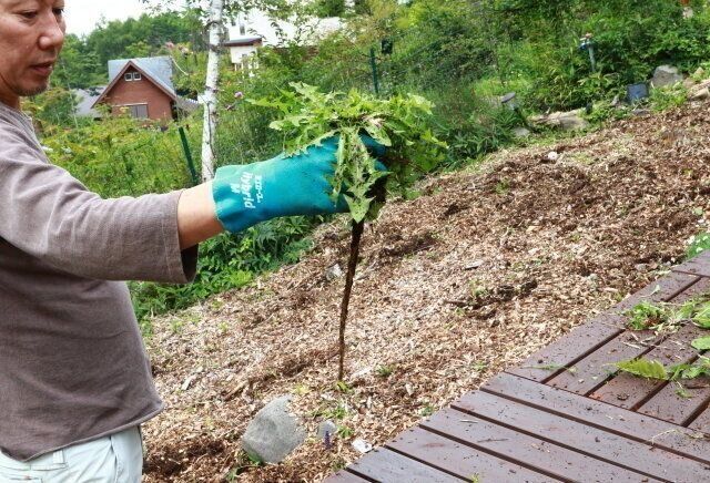 そこで意を決して、草刈り機ではなく、シャベルで周囲を掘りながらタンポポを根ごと抜くことにした。これがまた大変で、注意しないと根が途中で切れてしまうのだ。
