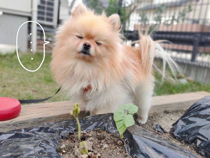 家庭菜園で育てているいんげんの芽が出たので、記念にぽぽちを添えて写真を撮りました。