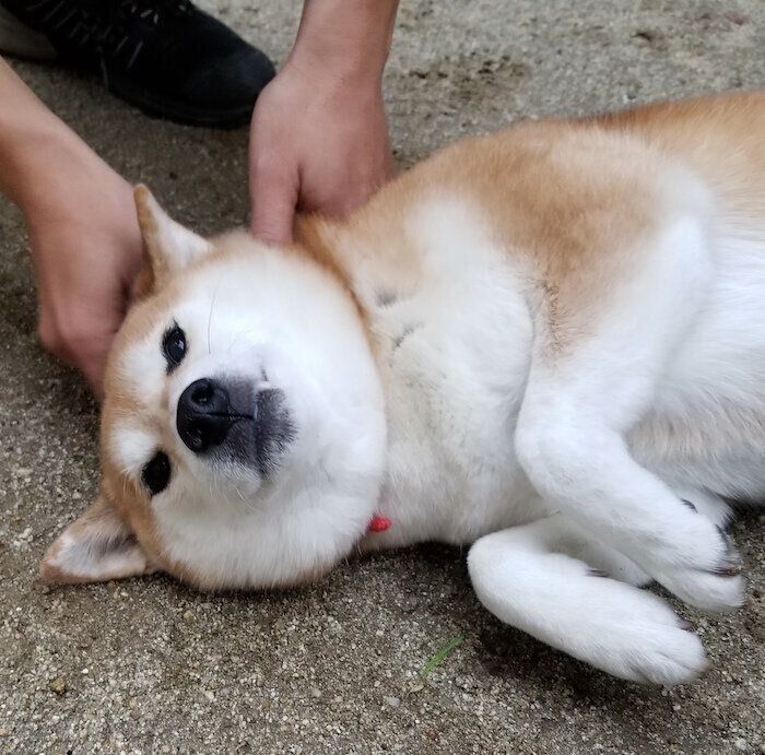 柴犬あるある、撫でを察知すると耳がしゅ〜っと開きつつ倒れていくとこ|連載「ここ掘れここ柴」vol.122