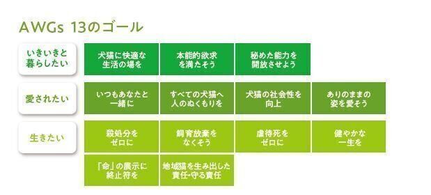 「犬猫に快適な生活の場を」「犬猫の社会性を向上」など、これから解決したい13のゴールが設定されています。