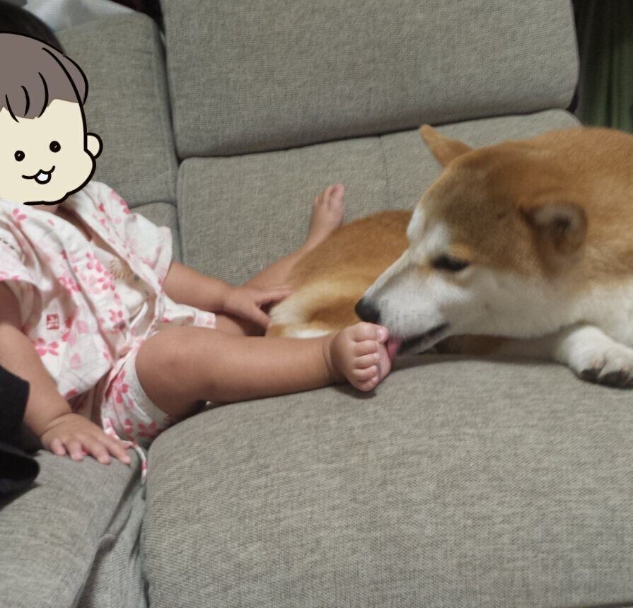 私がくるぞ、くるぞと思っていると、だんだん近づいてきてペロっと娘の足を舐めました。