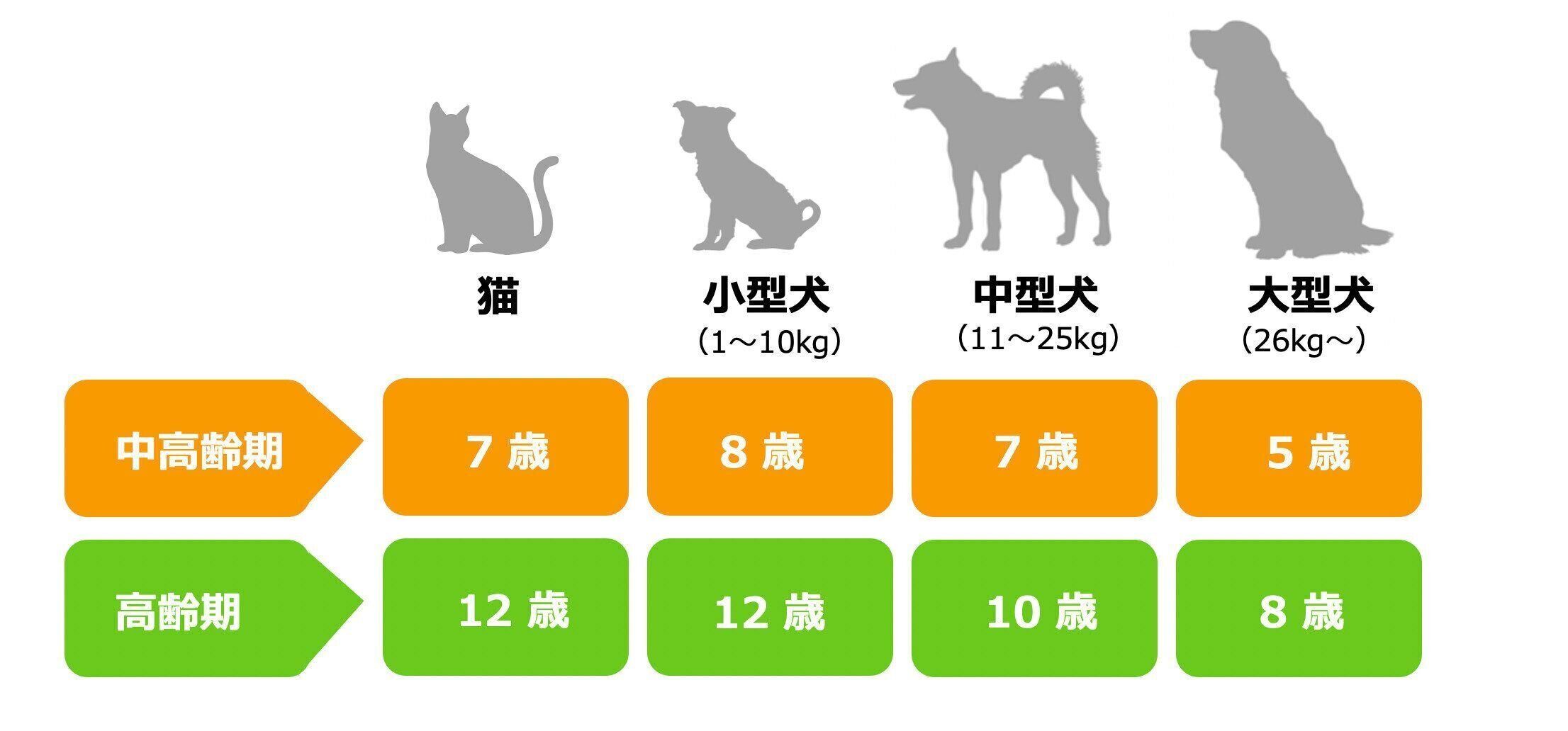 老化の症状が目に見えてからではなく、中高齢期の早い段階からケアしてあげることが大切です。中高齢期の始まる時期は犬のサイズによって異なります。小型犬では8才、中型犬では7才、大型犬では5才を目安に、少しずつ切り替えを検討するのがよいと思います。(尾身先生)
