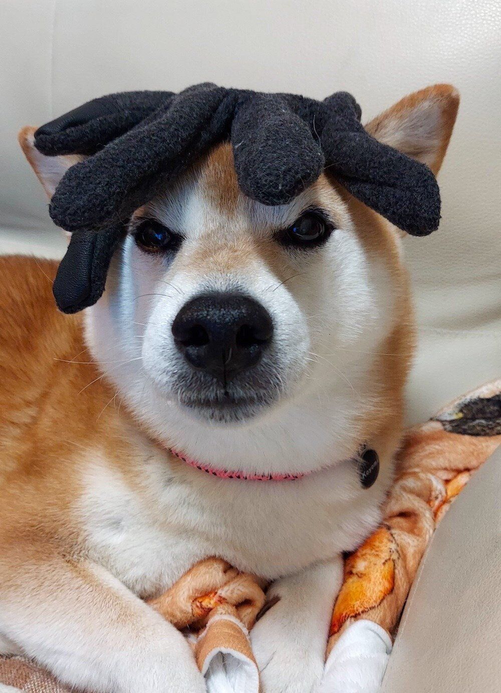 偶然こよみさんの頭に乗った手袋が、こよみさんの前髪のようになりました。
