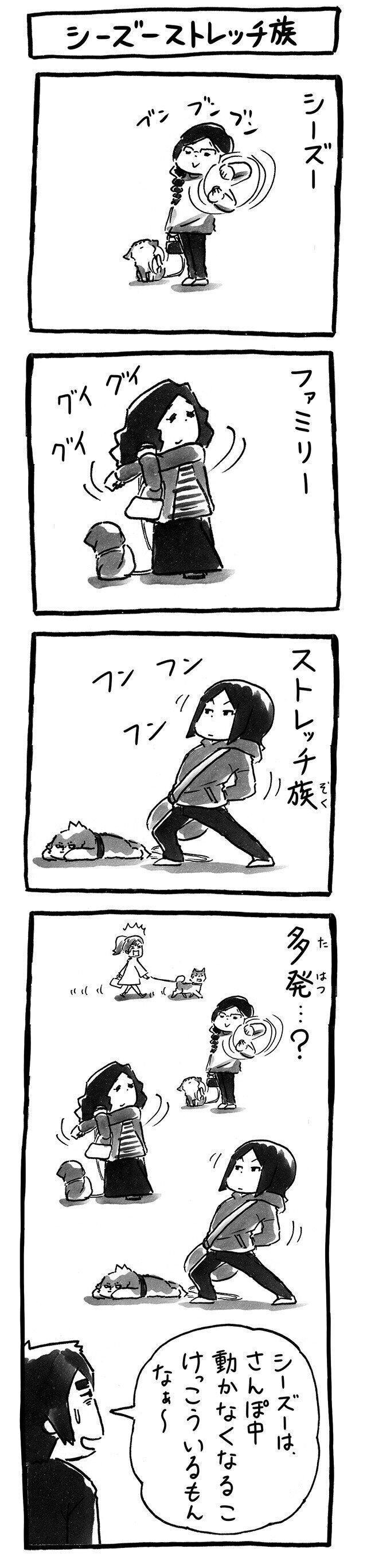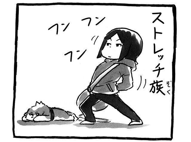 散歩あるある。ストレッチ中の飼い主の足元には、やる気を失った犬がいる|連載「シーズー犬のてんぽ」第125回