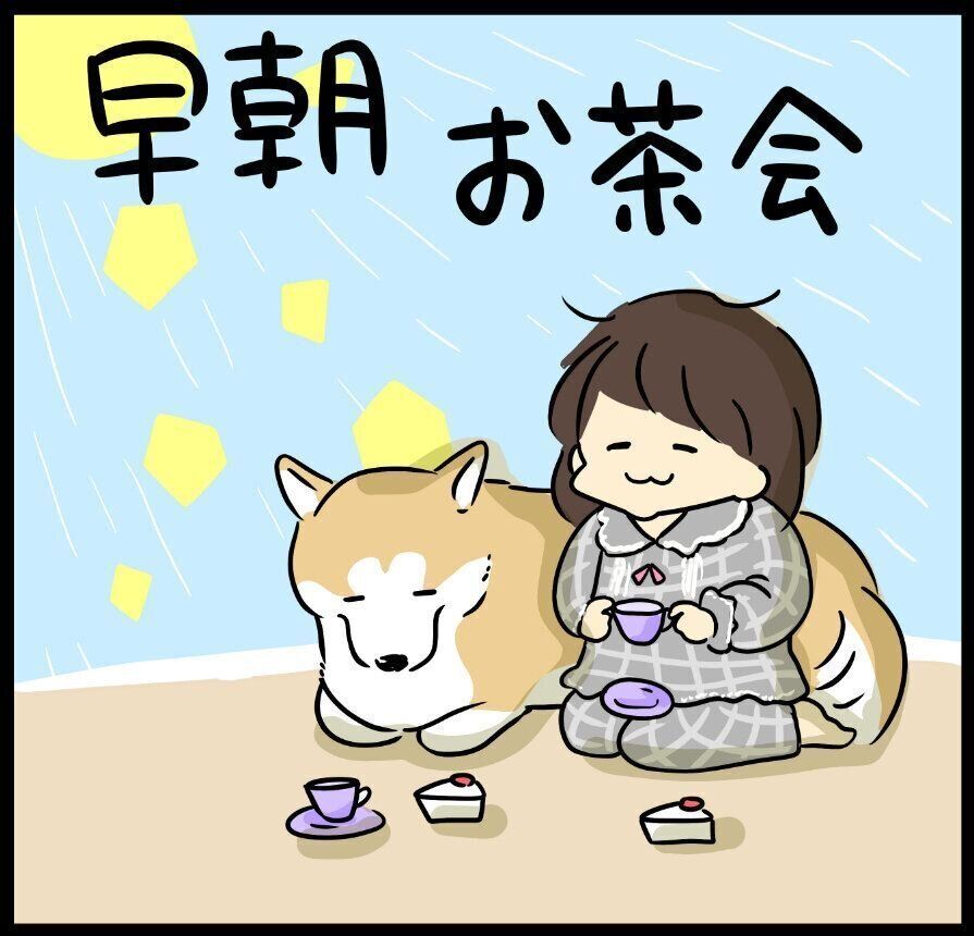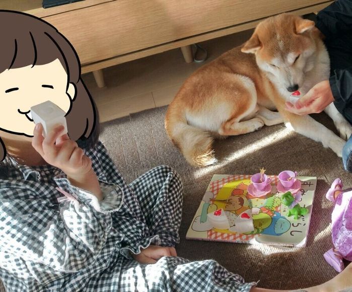 幸せそうなタロさん・・・だったのですが、起きてきたパジャマ姿の娘が、ティーセットと人形を持ってきました。