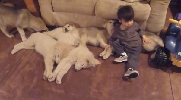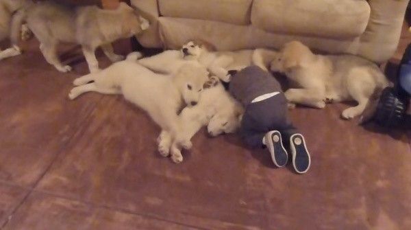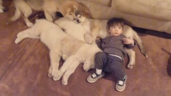 男の子はうまく寝つけないのか、1匹のワンちゃんに寄りかかってベッド代わりに。