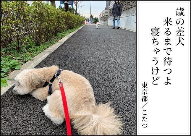 ゆっくり歩く先住犬を静かに待っているこたつちゃんが本当に可愛いですね!2頭のステキな関係性、見守る飼い主さんの温かな愛情が伝わる一句でした。