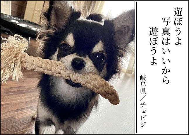 「お気に入りのおもちゃを持ってきてキラキラした目で遊んでアピールしてます。カワイイから写真撮るんですが、本人はそんなことどうだっていいから、『早くおもちゃ投げて』って顔してますね…!」(投稿者 チョビジさん)