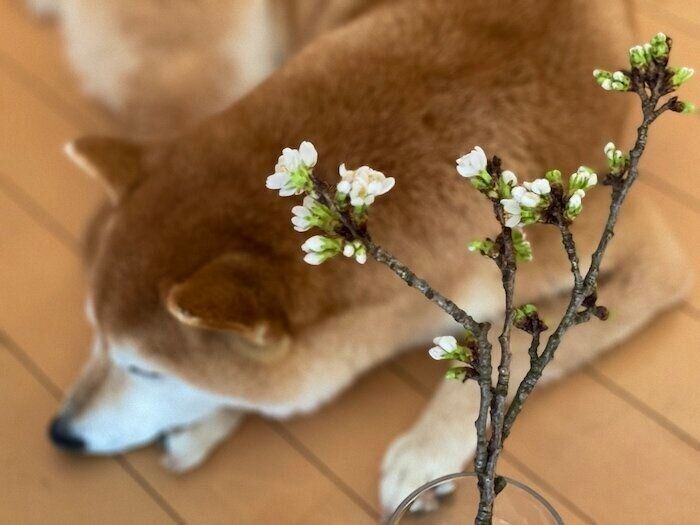 毎年お散歩中に春の嵐で折れた桜の枝を拾って帰り、水に挿すのが恒例となっています。今年も無事に咲かせることができました。