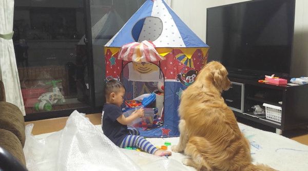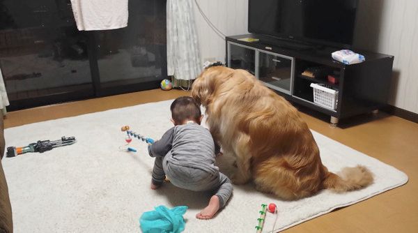 【犬動画】坊やを優しく見守るワンコ。まるで「ママ代わり」に♡