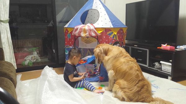 坊やが「青いお魚だよぉ」と、ゴールデンのももちんに見せながら、仲良く釣り遊び。