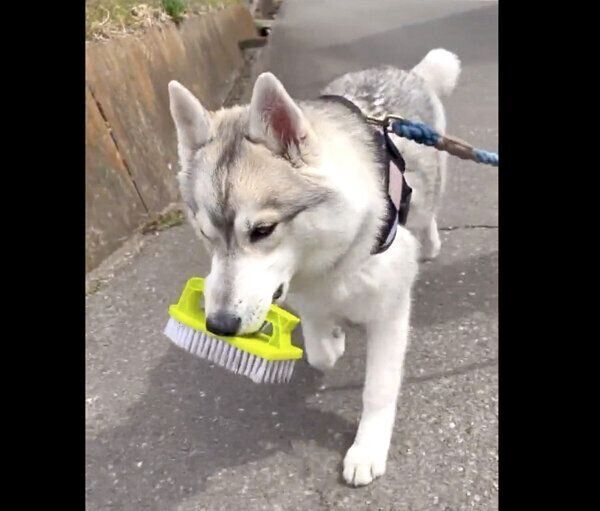 おもちゃを運ぼうとしただけなのに…「ひとり電車ごっこ」状態!? ハスキーのお茶目な行動の真相