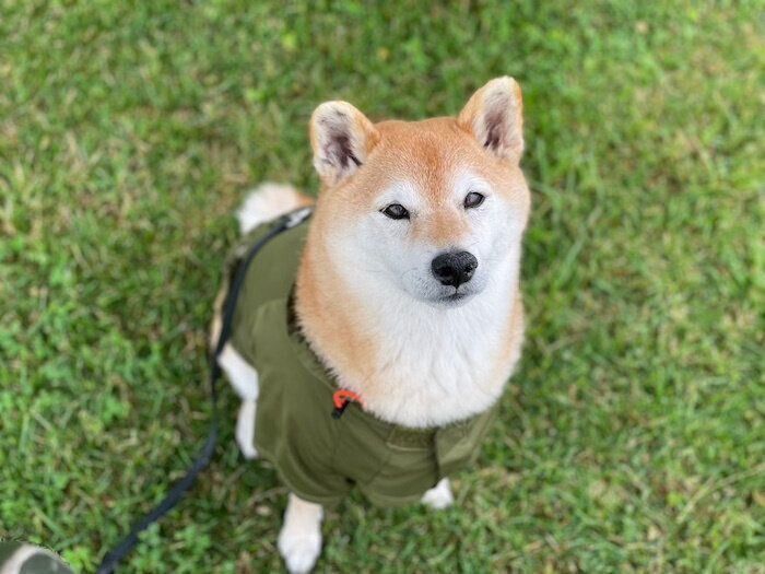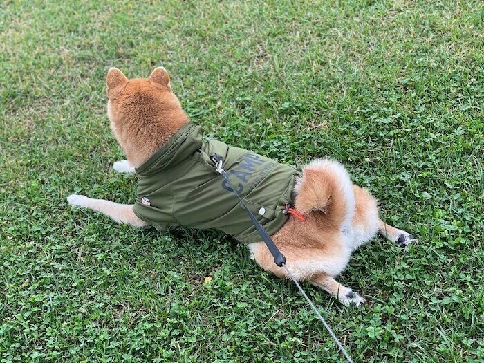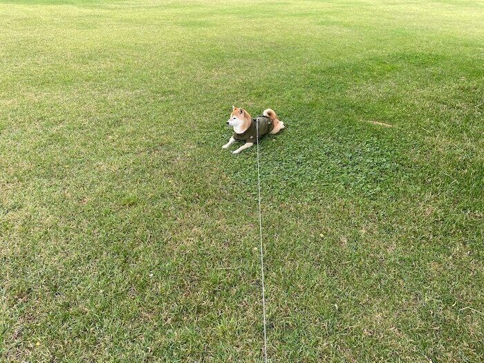 お散歩も雨も苦手な柴犬マロたん、公園の芝の上で佇み続ける