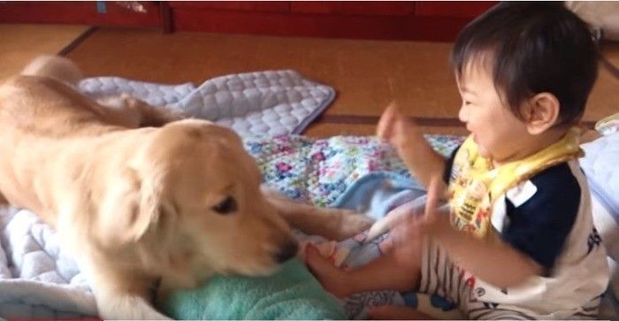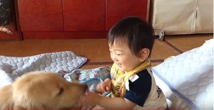 ワンコと赤ちゃんの絆にキュン♡となる、いやし動画でした♪