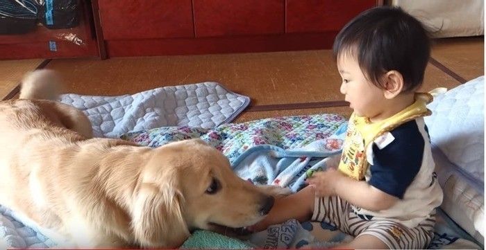 ベビーシッター犬!?赤ちゃんをあやすワンコ、一人と一匹の関係性にキュン♡