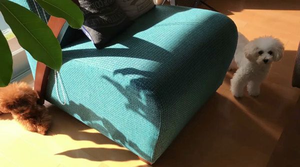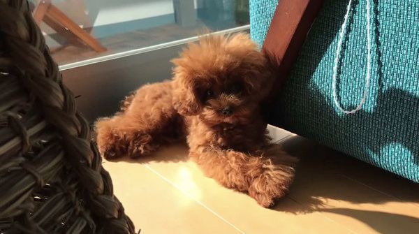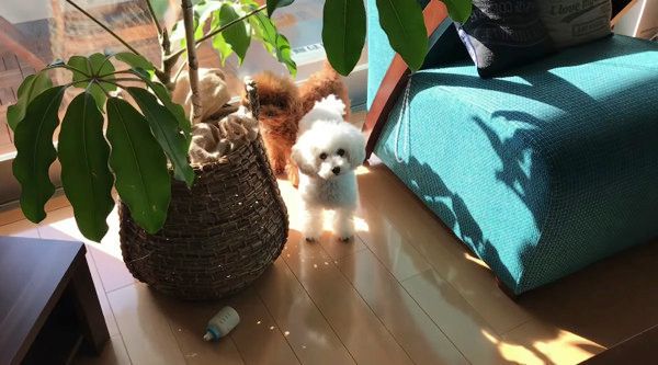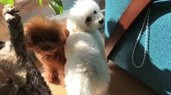 ティーカッププードルの「ひなこちゃん」と「さくらこちゃん」。まったく動じず、なにやら怪しい2匹( *´艸)