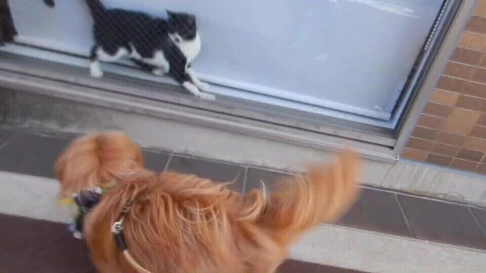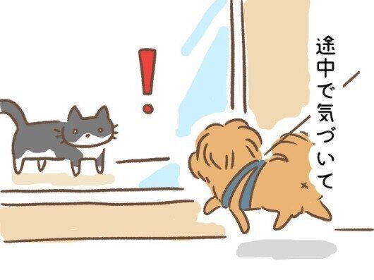 突然の遭遇に、ネコも犬も同時にびっくり|連載「こぐま犬てんすけ」vol.172