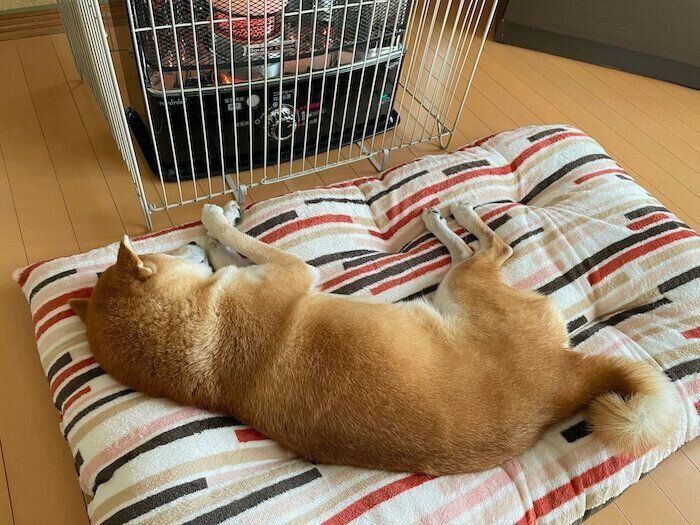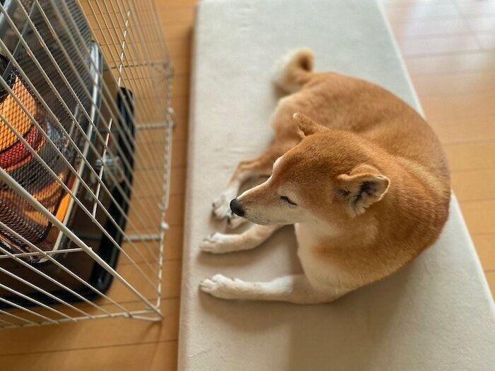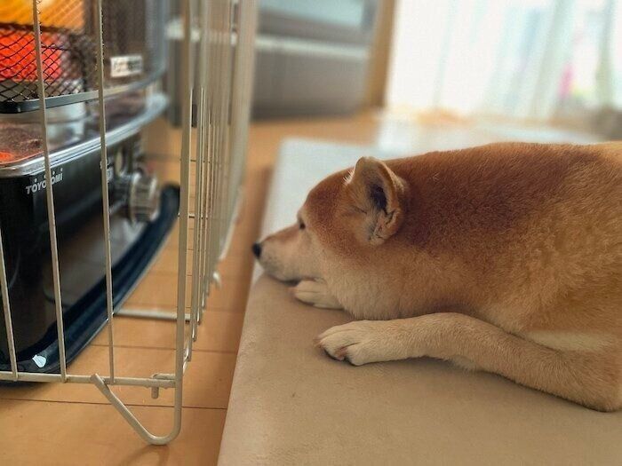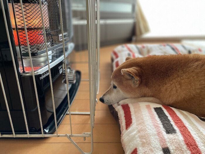 ストーブ好きの柴犬マロたん、ぽかぽかぬくぬくを堪能中です