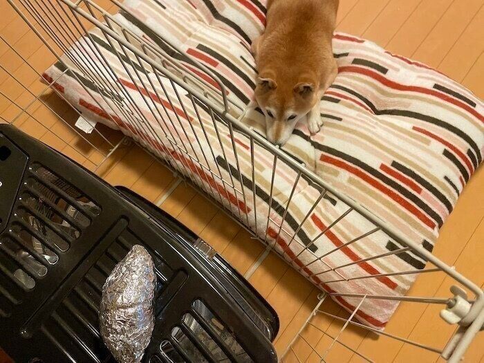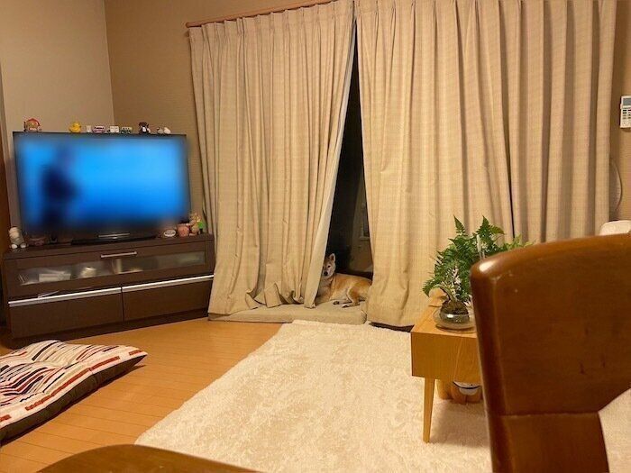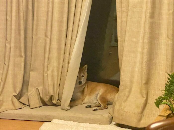 カーテンの陰から見つめる柴犬マロたん、お芋とストーブと冬毛のお話