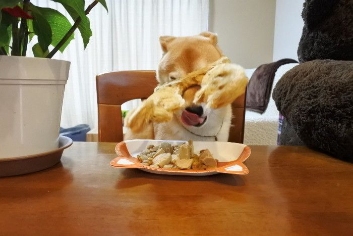 気分だけでもパーリーっぽくしようと、同じく100円ショップで購入した柴犬の紙皿に盛り付けてみましたが、いつもの食器より「餌」っぽくなっちゃいました。