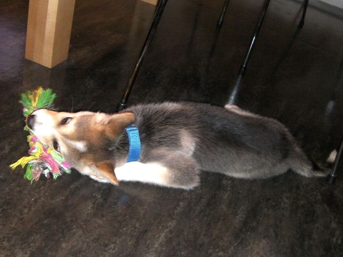 我が家に着いたときの様子は元気そのもの。何事もなかったように、ロープのおもちゃで遊んでいました。