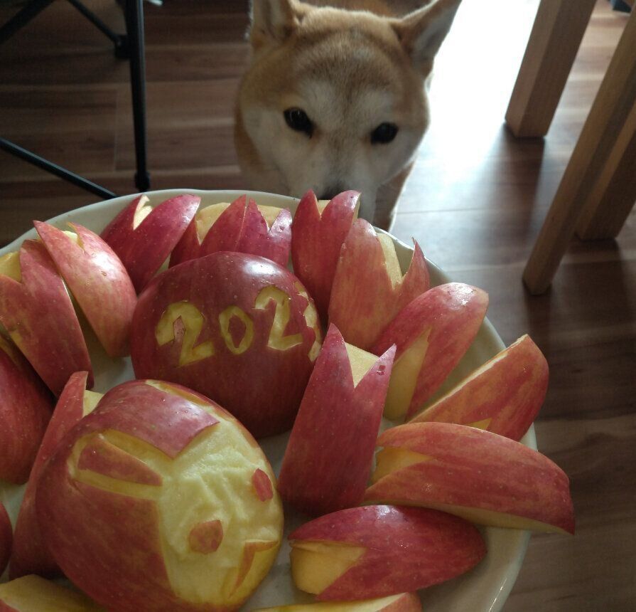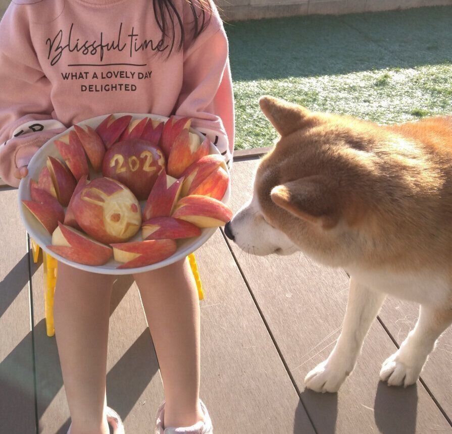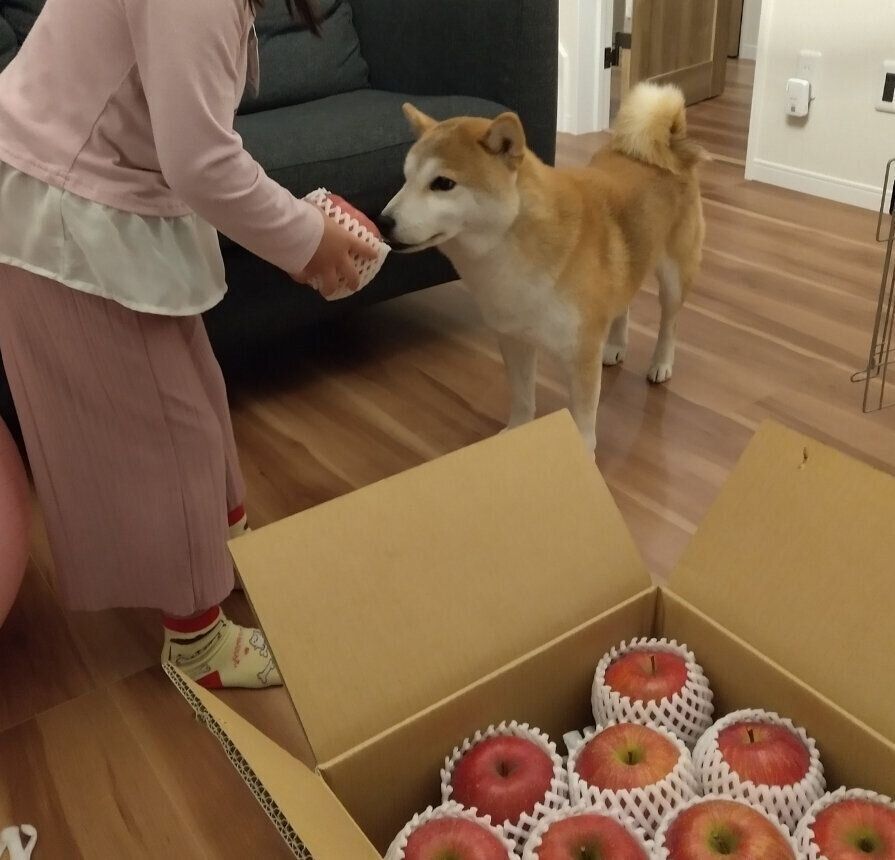 撮影中もリンゴが気になるタロさん