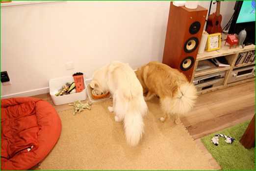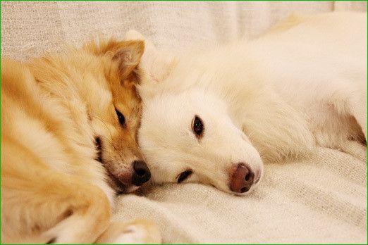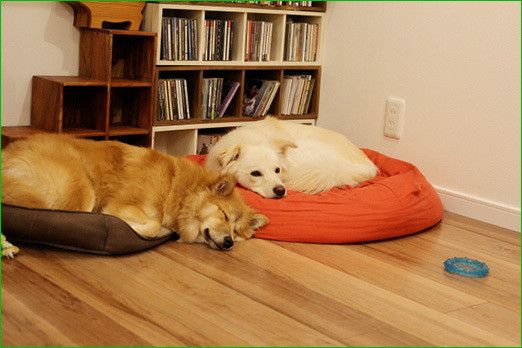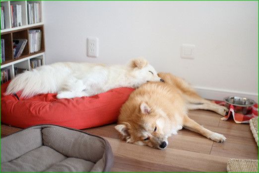 よく写真ではソファで2頭がくっついていたりするので「すごく仲がいいんですね」とかいわれるが、あれはだいたい大吉がいるところに福ちゃんが後からムギュッとくっついている場合が多い。逆に大吉から福ちゃんにくっついていく場合もあるが、そういうときは福ちゃんが遊び疲れて寝ているときで、あのモフモフ具合がちょうどいいのか、枕として「利用」している感が強い。