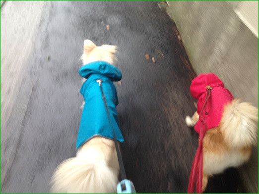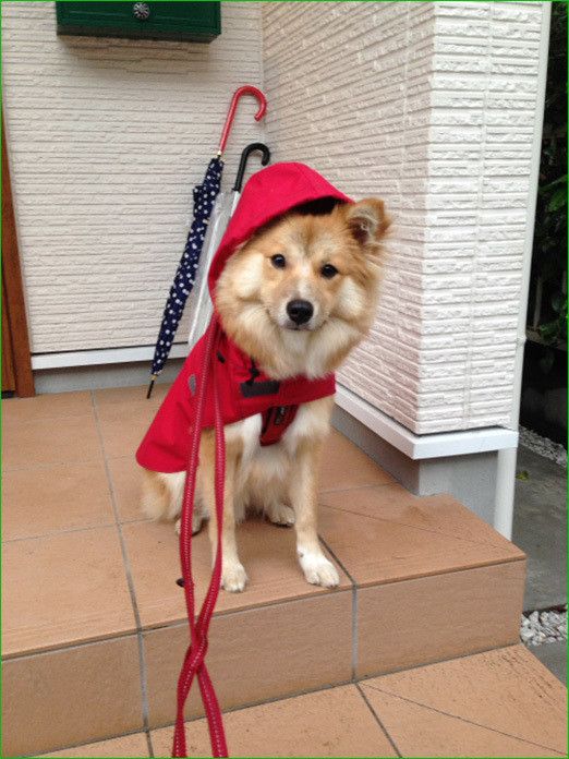 以前この連載でオーダーした大吉と福助の『レインコート』ができあががってから、なぜか雨の日が少なかった(散歩時)。先日ようやくまとまった雨が降ったので、そのときにレインコートを使ってみた。が、思いのほか雨が強かったため、一眼レフでゆっくり撮影している余裕はなく、スマホでさっと撮った写真なのでブレブレですが、リアルなレポートということで。