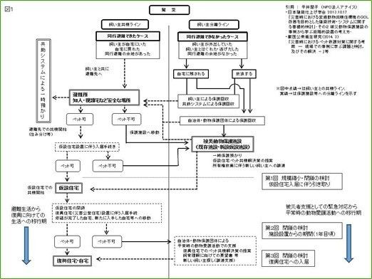 平井:その一方で、ペットたちがいるから生きる力になっていることもあると思うんですね。ペットの存在というのは好きな人にとってはすごく大きいので。なんとかそういう人たちがペットといっしょに避難できるようにアナイスでは一応避難フローというのも作っているんですが、何かあってからでは遅いので、少しでも参考になればと思っています。飼い主さんとペットが、できる限り「飼い主共棲ライン」の流れに乗るためには、避難時・避難所・仮設住宅などの節目節目を、どのように乗り切るか、何を備えておけばいいのか、ぜひ考えてみてください。