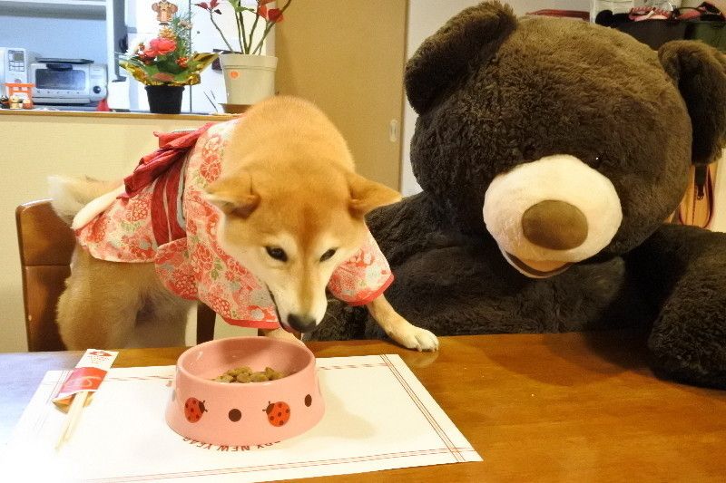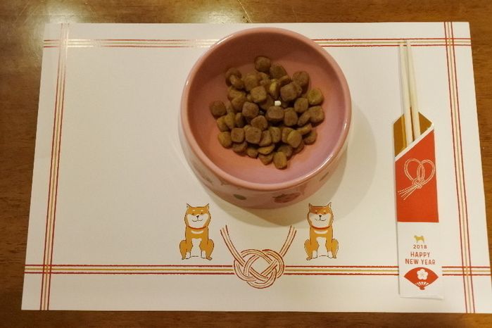 せめてお正月らしくしようと3COINSで購入したランチョンマットを敷いてみました。お箸の位置がこれで良いものか悩みましたが、箸袋のデザイン的にはこうかしら…ってマロたんにはお箸は必要ないですね(笑)