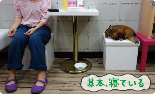 ドッグカフェでのお留守番中は、その大半を穏やかに睡眠に費やすが、腹時計はとても正確で、時間になるとスクッと起き上がり、キッチン前にて待機する。
