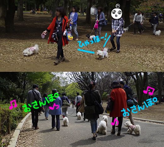 お散歩が終わるころには、白いワンコたちが土色になってしまったよ。