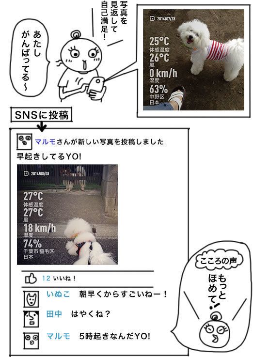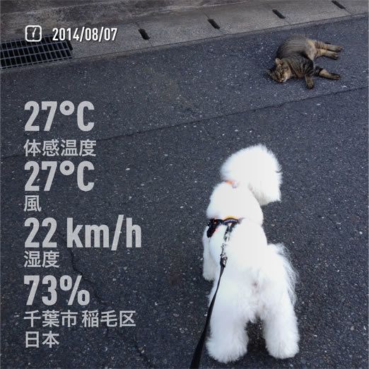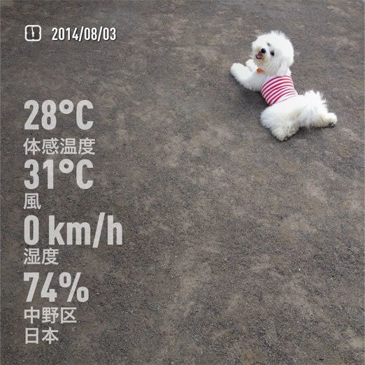 ついでに、私がちゃんと早起きをしてマシューと散歩をしているか怪しんでいるヒサンに証明できるように、時間や天気、気候を載せてくれるスマートフォンカメラアプリを使って、こんな感じの写真をね!!