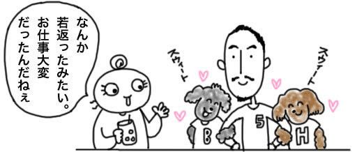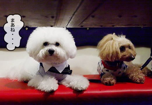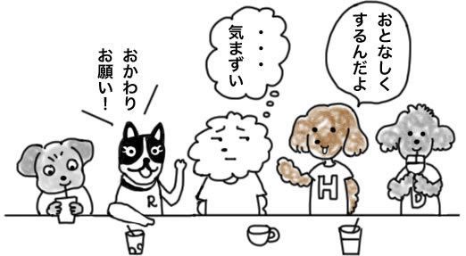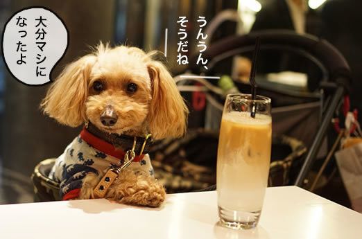 見て↑、ハウルが人間たちの会話にすっかり参加しているの!カフェのお客ワンコの治安を守る看板犬のお仕事を卒業して、すっかりソフトで甘えん坊な表情になってたよ。