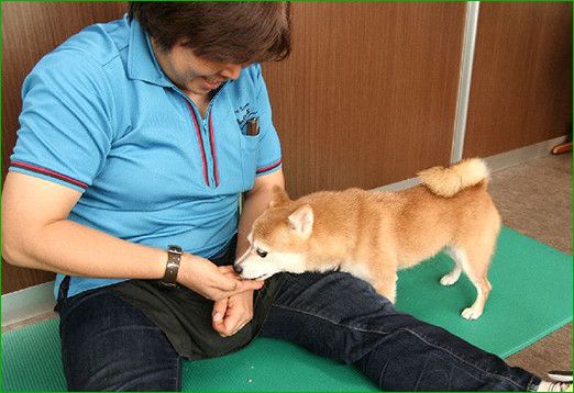 こむぎはいつも人の足を飛び越えてしまうので、ゆっくりまたぐことから覚えます。トレーナーの伊藤さんが「またぐだけ、こんな簡単な運動でも足をしっかりあげるので筋力アップになるんですよ」と教えてくれました。おやつのニオイに誘われて、がんばるこむぎさん。