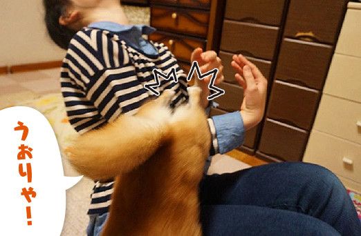 胸元を蹴って脱出です。蹴られて『ぐふっ!』となる次女(笑)。