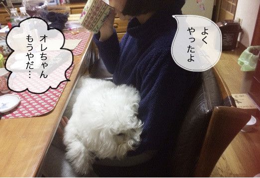 相当弱っちゃったみたいで、私の膝の上に逃げ込んできてぐったりよ。仲よくやっていけそうと思った矢先に、やっぱりダメか、と落胆してたんだけど、マルモは見た!