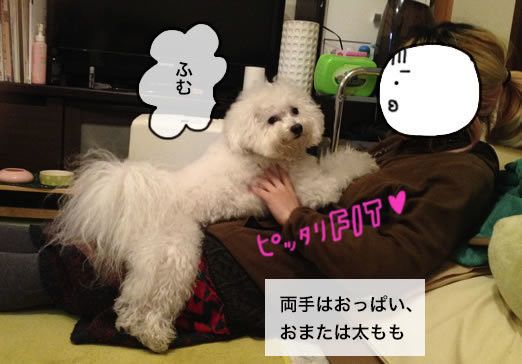 私はあれ↑を『おっぱいおまた』と呼んでいる。ヒサンにしかしないのよ、この恰好。ヒサンはこのハレンチなコミュニケーションを「へんたーい!きもいー」とか言いながら毎度やってくれて…。