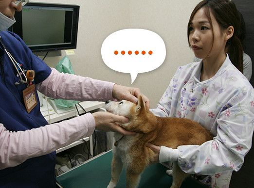 最初はジッと耐えて受診をしていたこむぎも、目に光を当てられると落ち着きがなくなってきました。最後には、私に助けを求めてしがみつくような仕草まで。こむぎさん、よく頑張ったね。検査はこれで終わりです。いっしょに先生にお話を聞きましょう。