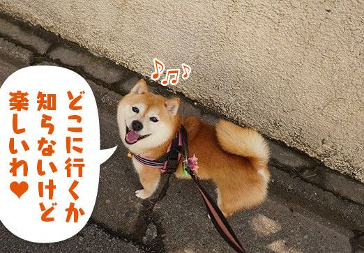 道中、満面の笑みで私を見上げるこむぎ。かなり良心が痛みましたが仕方ありません。このまま歩き続けると、こむぎにとっては苦手な所(動物病院)に辿り着いたと気がついたのか、一気にさえない表情に。