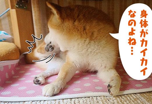 かゆくて大変なのはわかるけど、後ろ足がブンブン動く姿に思わず微笑んでしまいます。ゴメンね、こむぎさん。