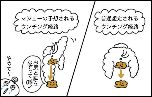 ほんと参る!ウンチの固さがいい具合だと毛に絡まないで落ちてくれるんだけど、しっとり以上のウンチはもう阿鼻叫喚(心の中で)。立ちはだかるウンチング問題、どうやったら普通に四つん這いで踏ん張ってくれるようになるかしら。