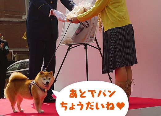 『今回ポスターのモデルになった柴犬のこむぎちゃんです』と紹介されて上がったステージでは、記念品の贈呈が。こむぎには食べきれないくらい大きな骨型の犬用パンをいただきました。
