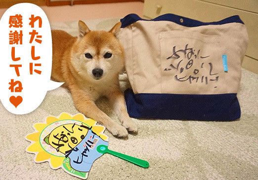 そして厚かましくサインもお願いしちゃいました。この日のために用意しておいたヒマワリのかわいいうちわと、柴のシルエット&ふなっしーが描かれた「Funa-Pet」のトートバックです。