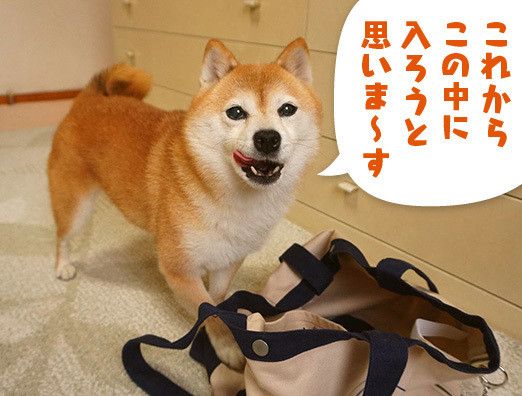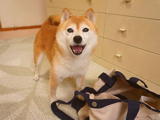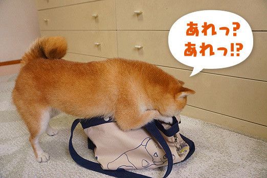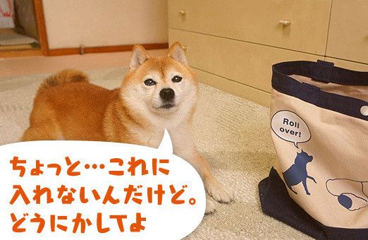 こんな風に狭い場所が好きなこむぎの前に、ふなっしーのトートバックを置いたらどうなるんだろうと試してみました。興味津々で近寄り、ニオイをかいだりしています。